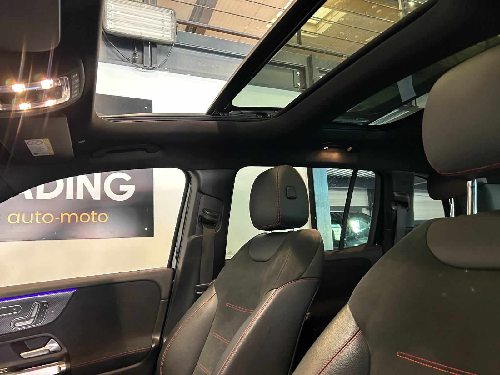 Partie centrale des contre-portes/accoudoirs recouverts de microfibre DINAMICA noire avec doubles surpiqûres rouges.