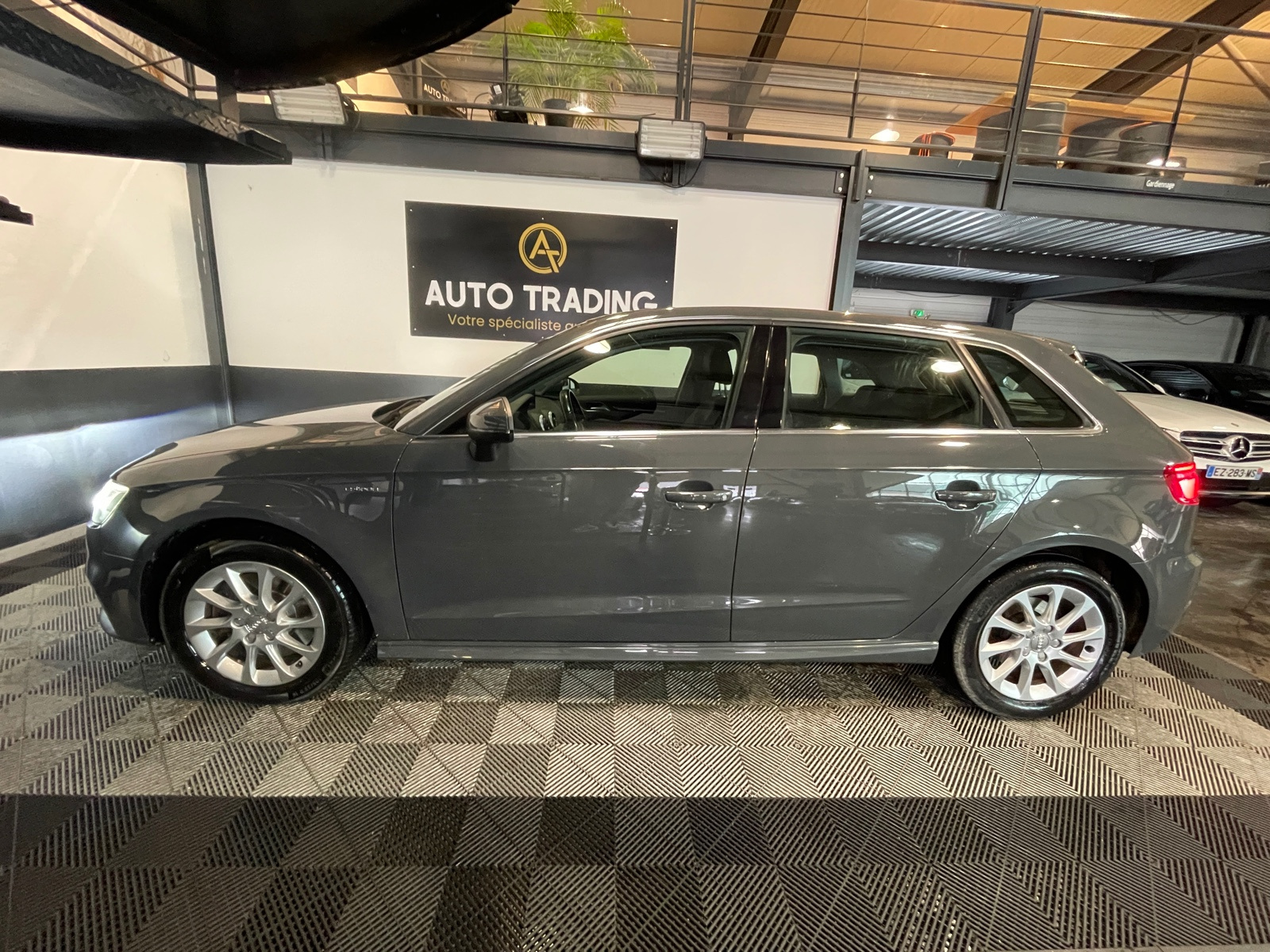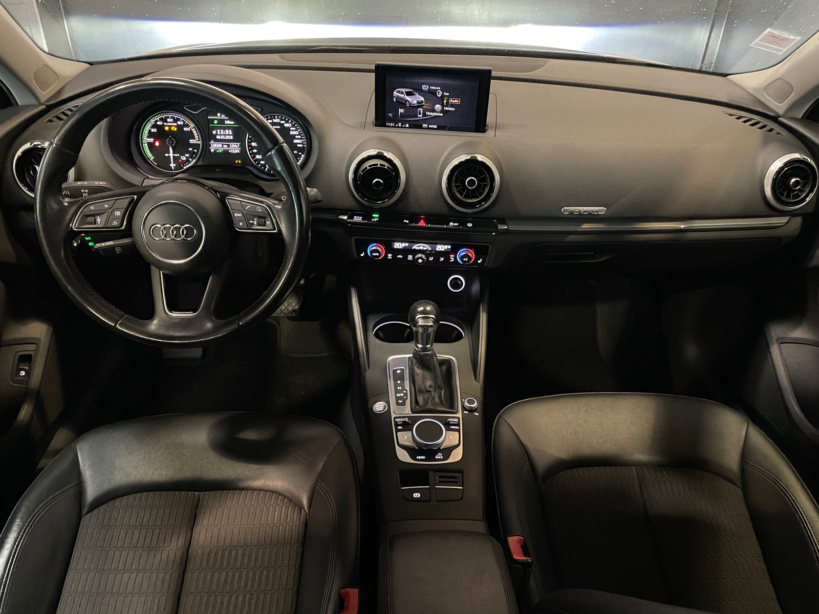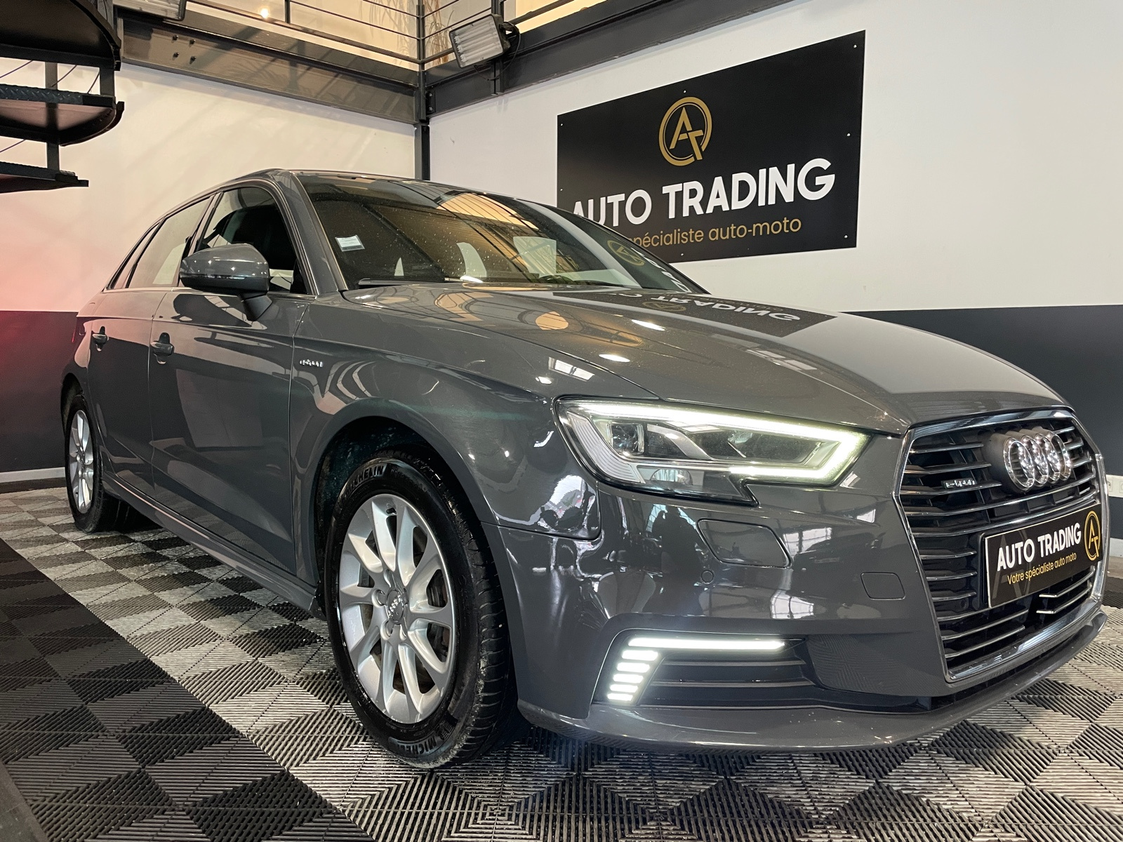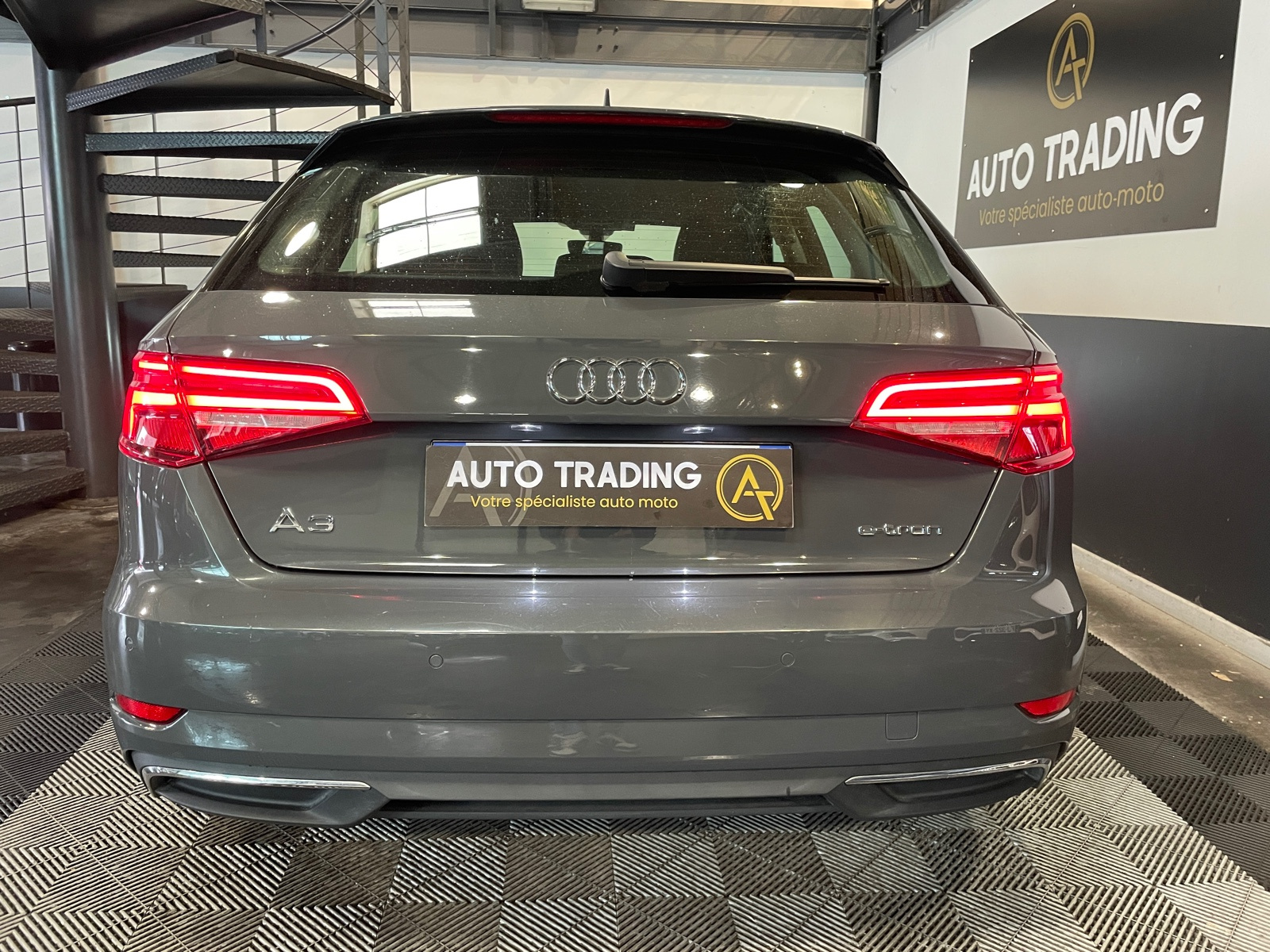 Identification du modèle/technologie : inscriptions e-tron à l'extérieur sur la calandre singleframe , le hayon, les ailes AV et les moulures de seuil ; inscriptions e-tron à l’intérieur sur le pommeau du levier de vitesses et sur le tableau de bord côté passager AV