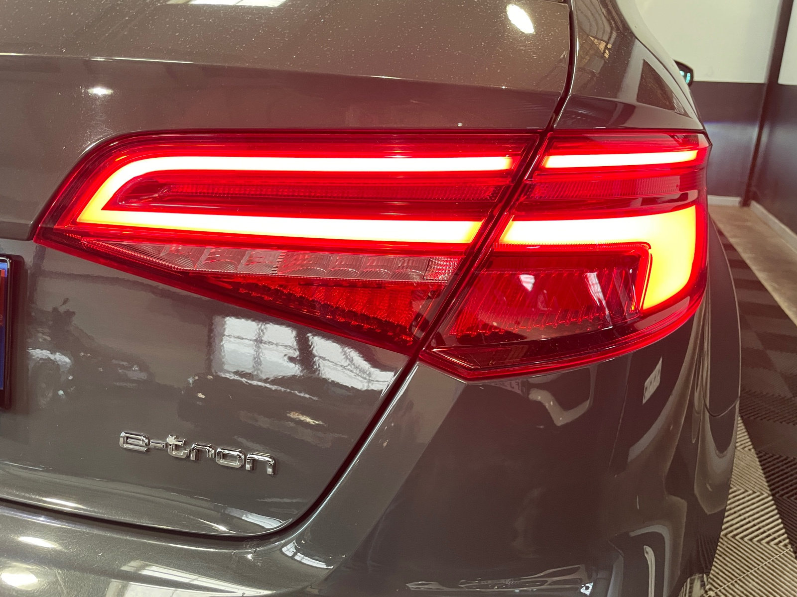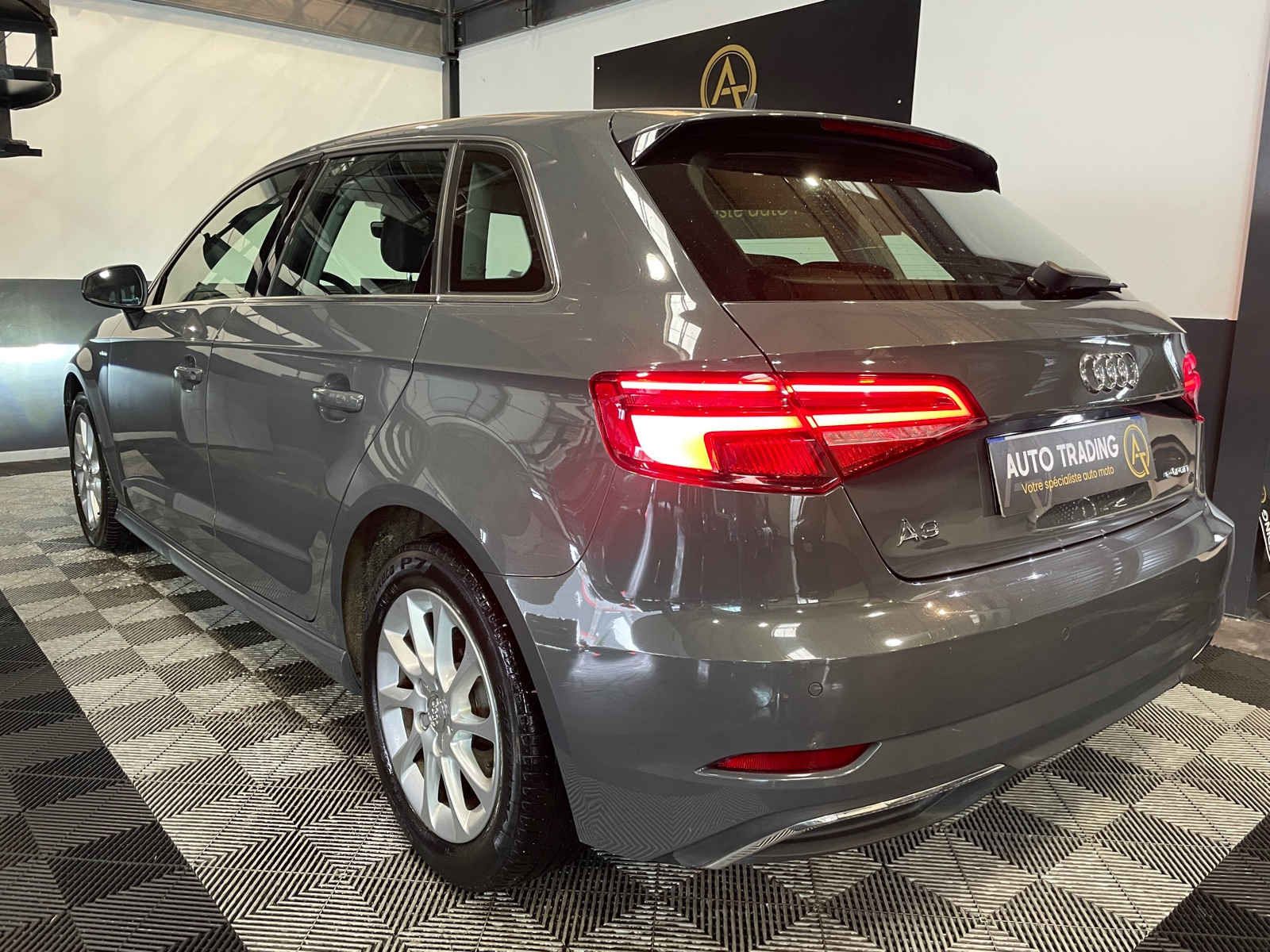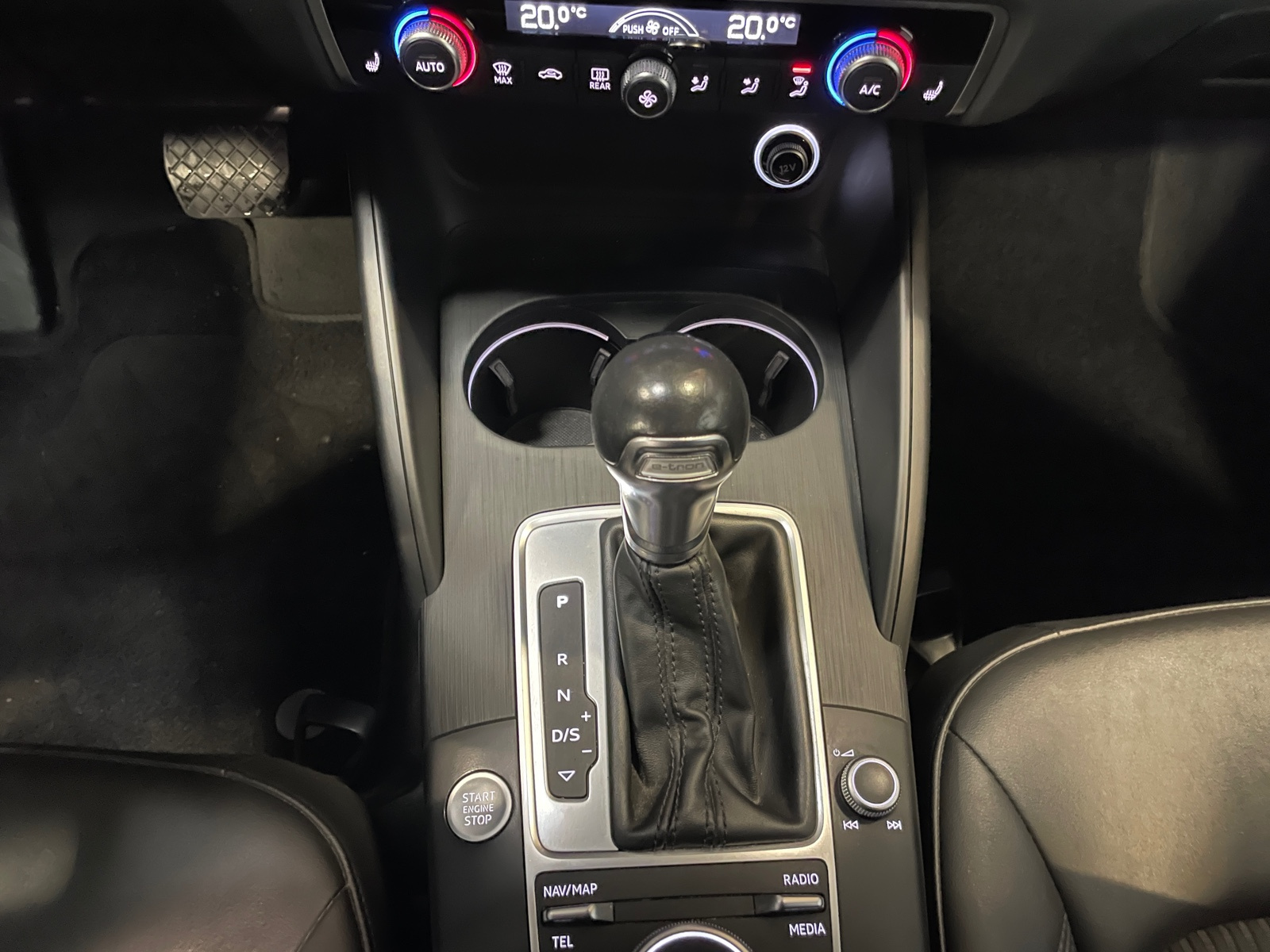 Identification du modèle/technologie : inscriptions e-tron à l'extérieur sur la calandre singleframe , le hayon, les ailes AV et les moulures de seuil ; inscriptions e-tron à l’intérieur sur le pommeau du levier de vitesses et sur le tableau de bord côté passager AV