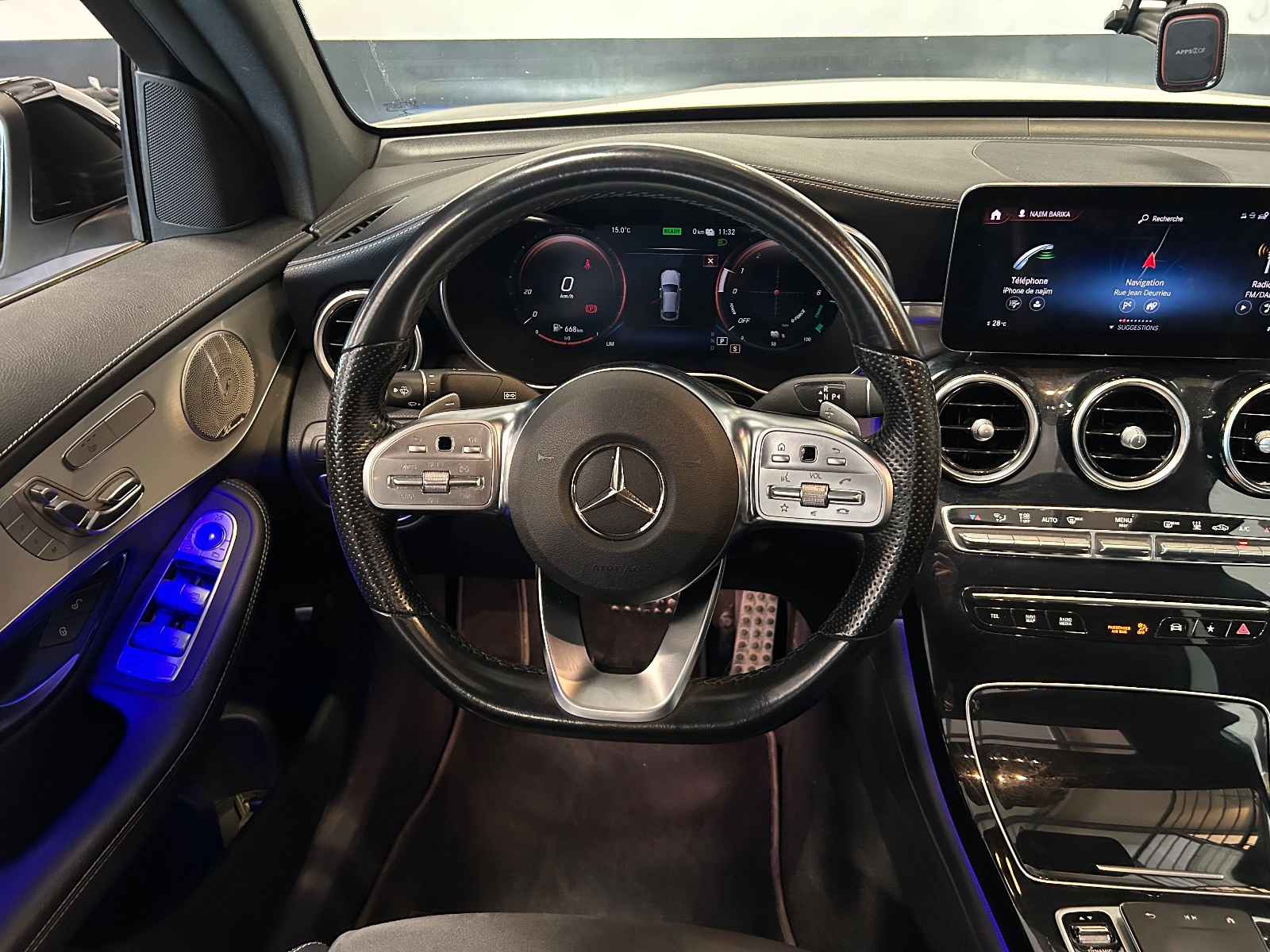 Volant sport multifonction à 3 branches revêtu de cuir Nappa noir, avec surpiqûres noires, méplat dans la partie inférieure, marquages profonds dans la zone de préhension, boutons Touch-Control et cache chromé argenté